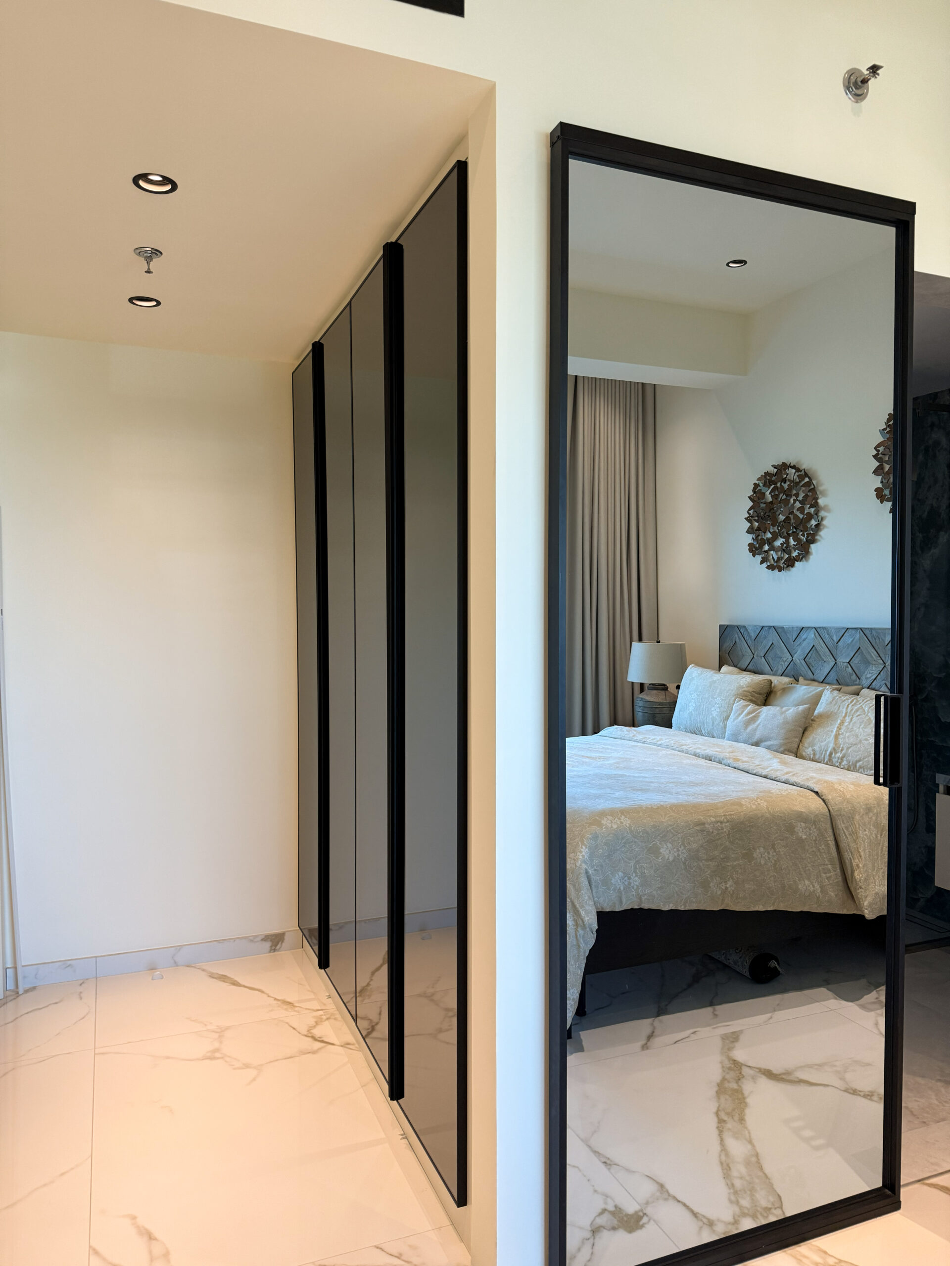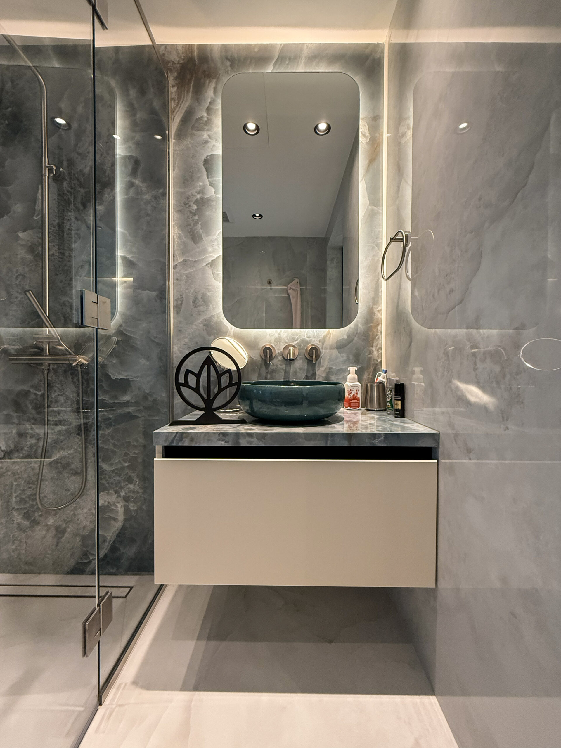 Custom storage solutions are intelligently integrated to maintain a clutter-free environment, combining practicality with refined detailing. Optional ambient and integrated lighting enhance architectural elements, adding depth and warmth while reinforcing the suite’s serene character.