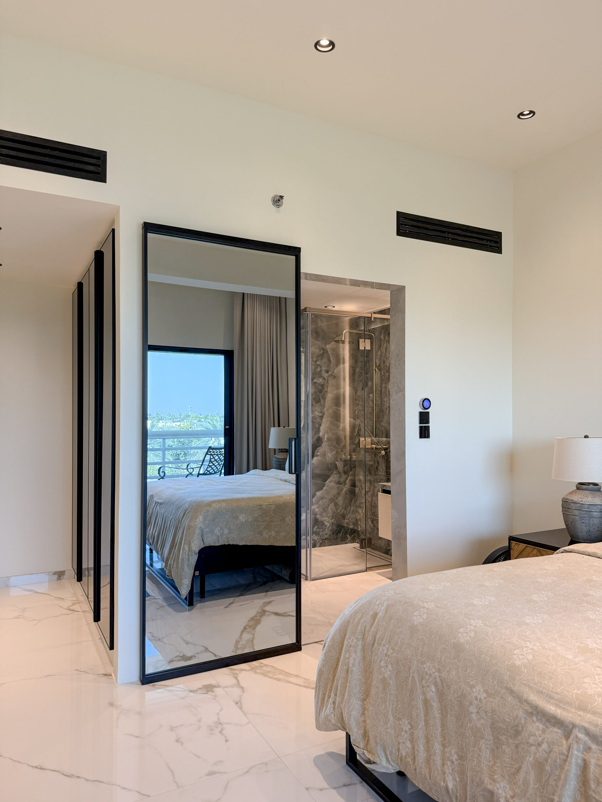 Crafted with precision and high-quality materials, this modern master suite reflects expert craftsmanship and attention to detail. Ideal for contemporary luxury homes, it offers a harmonious living experience where elegance meets functionality, transforming the private space into a sophisticated retreat defined by subtle design and seamless spatial transitions.