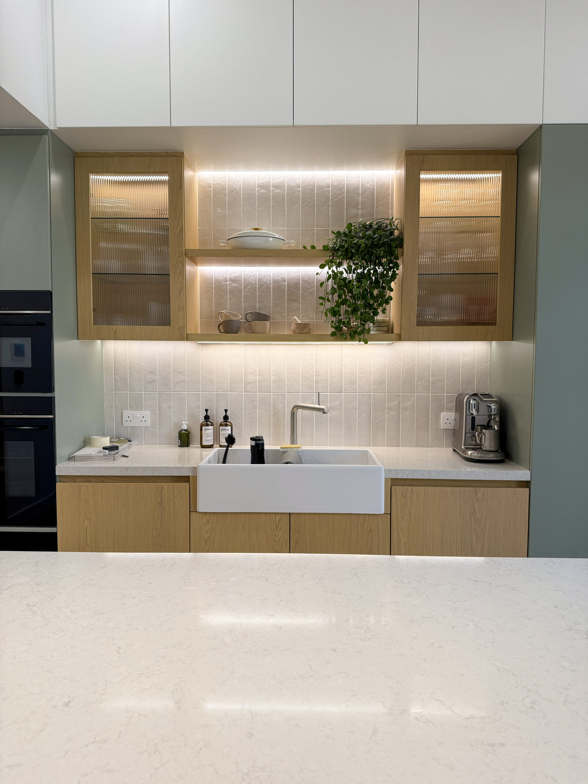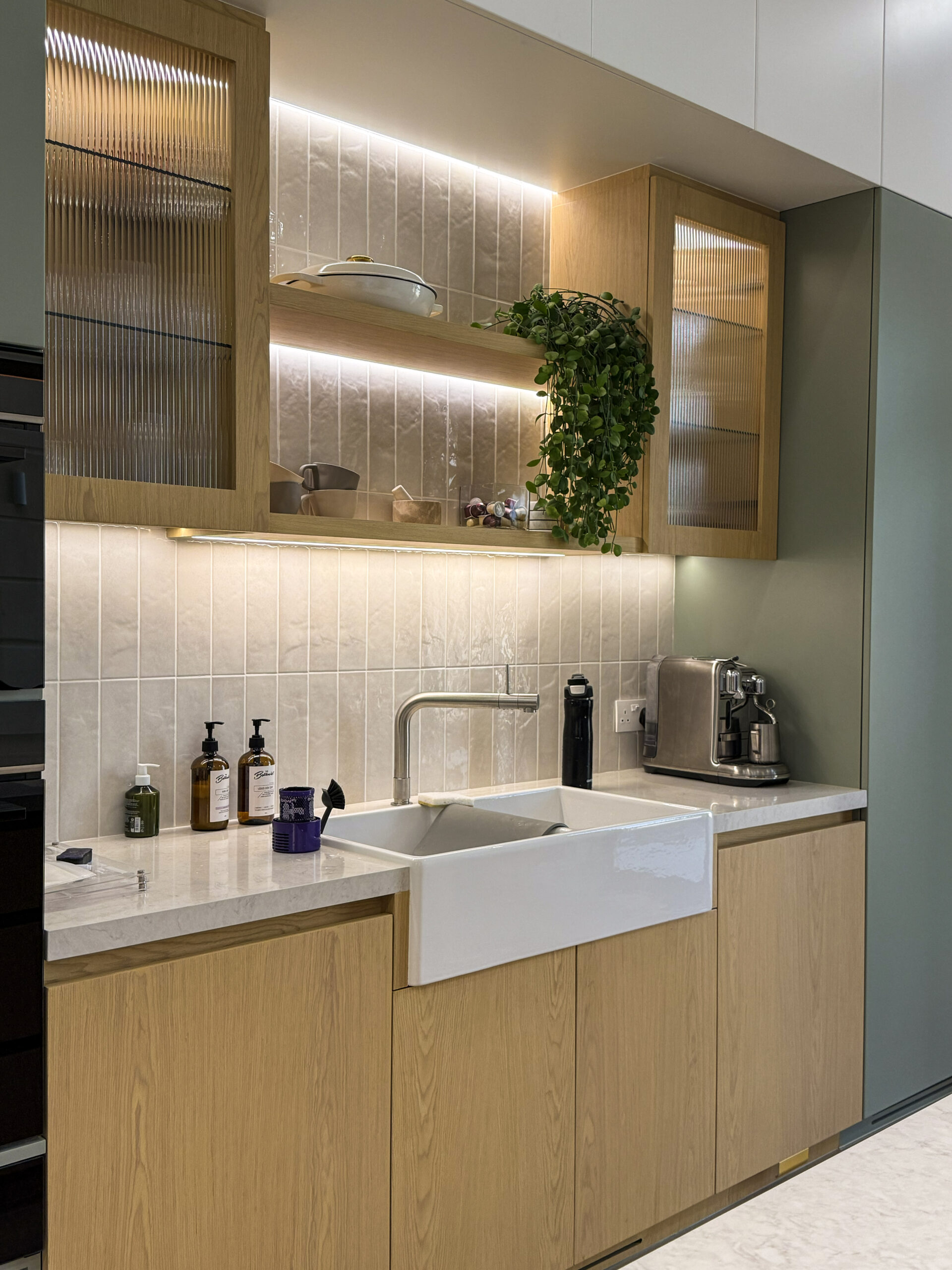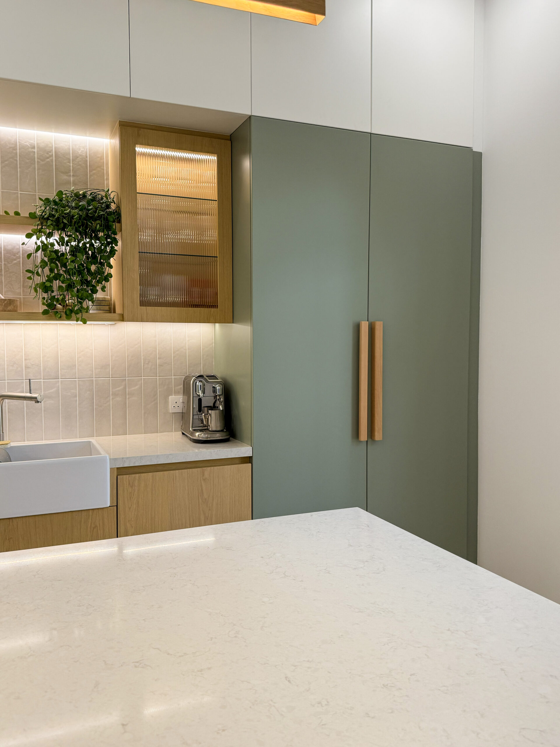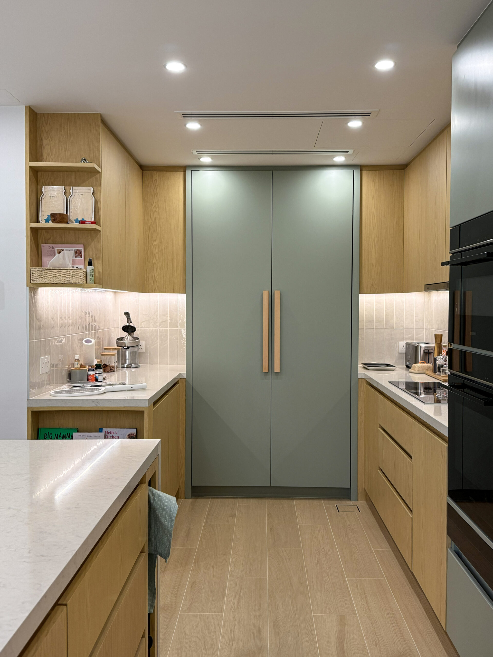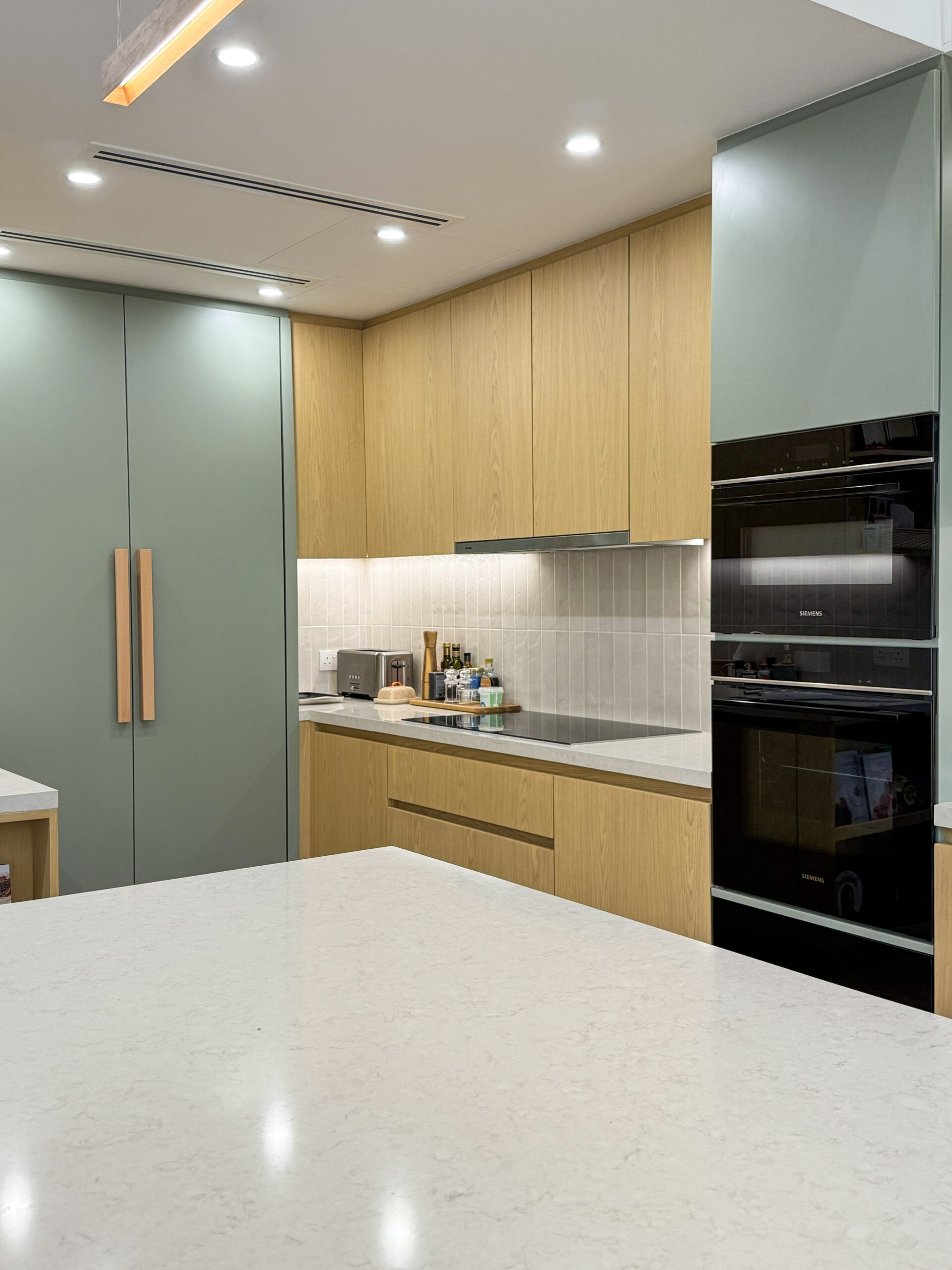 Natural oak tones bring warmth, texture, and a timeless character to the cabinetry, creating a welcoming atmosphere while maintaining a sleek and modern aesthetic. Precision-crafted joinery ensures seamless alignment, smooth finishes, and long-term durability, highlighting the quality and attention to detail in every element.