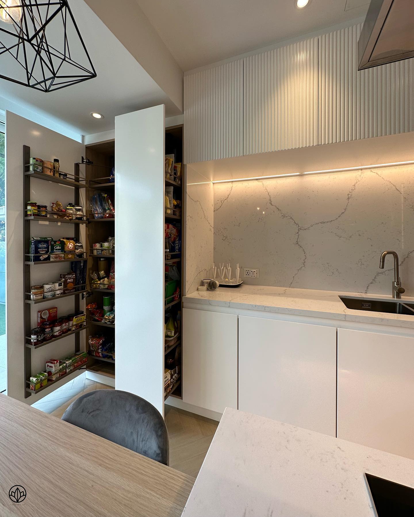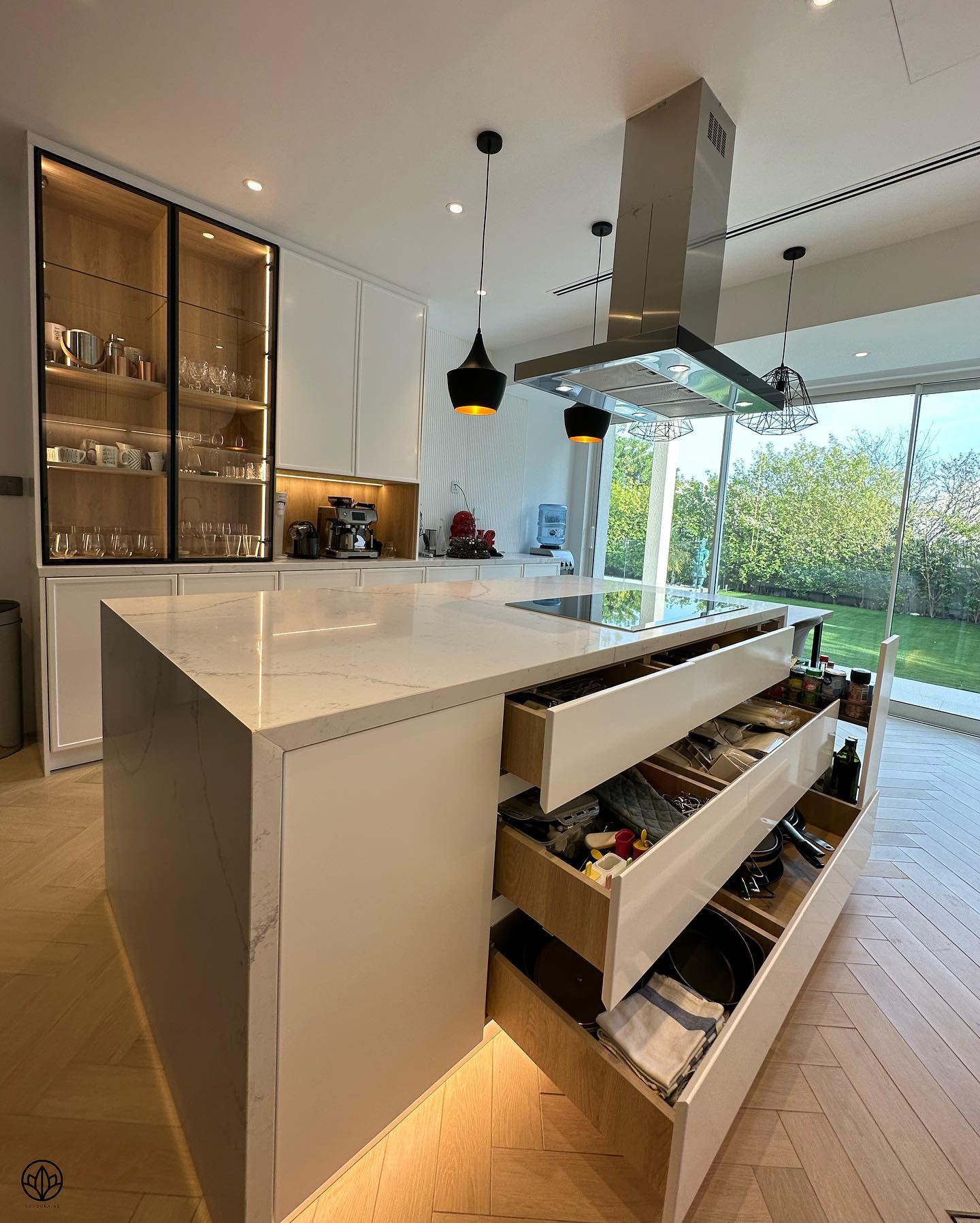 - Open Shelving and Storage Solutions: To maintain the clean, uncluttered look, contemporary kitchens feature open shelving, where everyday items like dishes or glassware are displayed. Hidden or smart storage solutions, such as pull-out pantry shelves and soft-close drawers.
