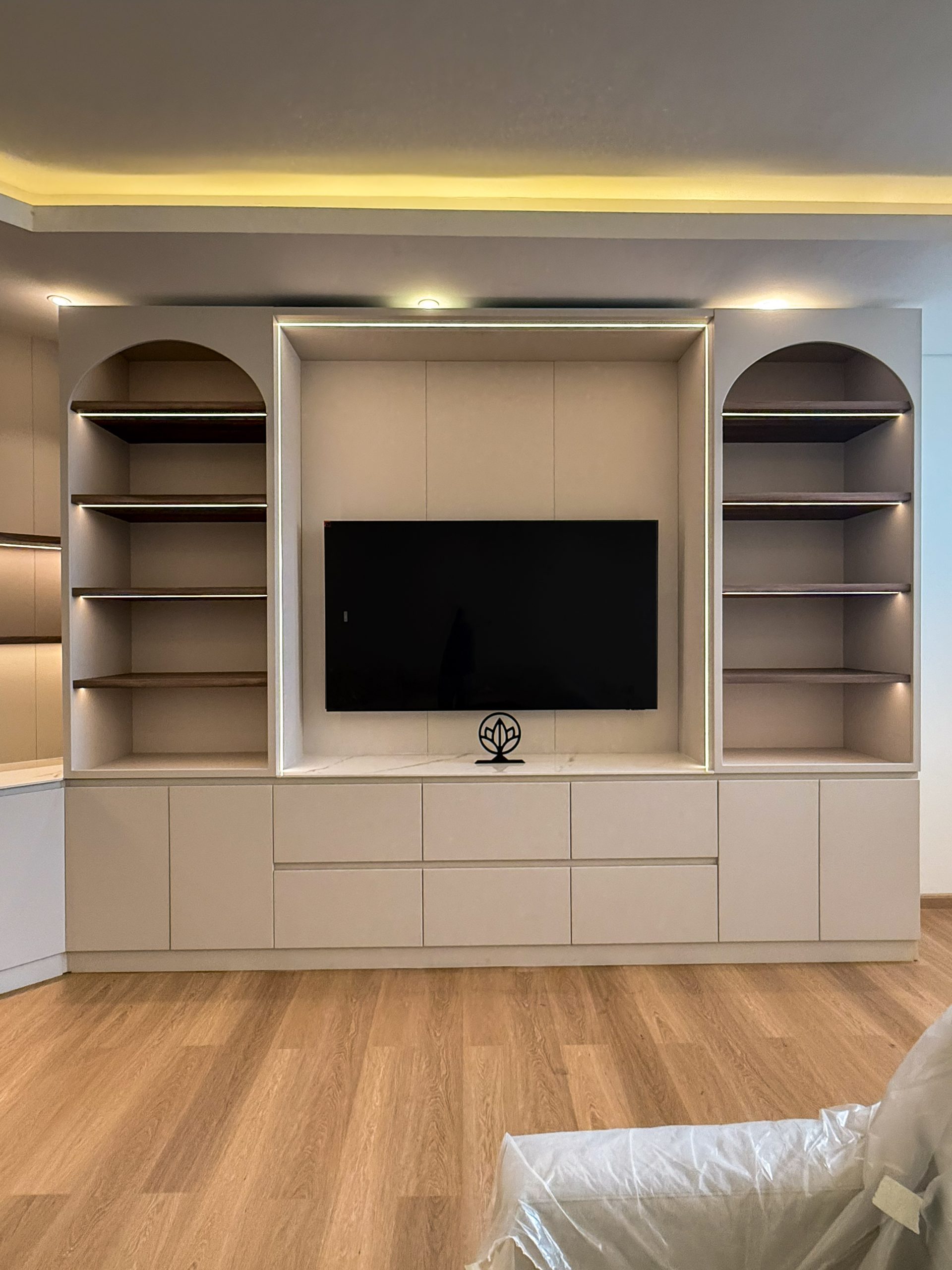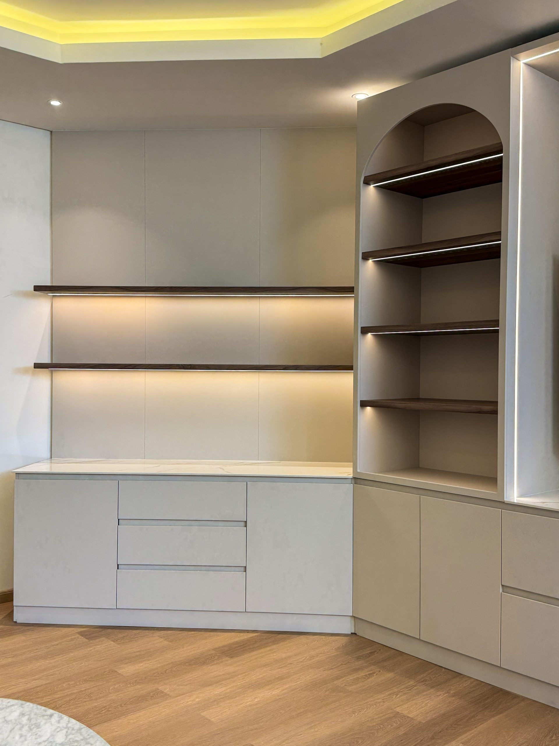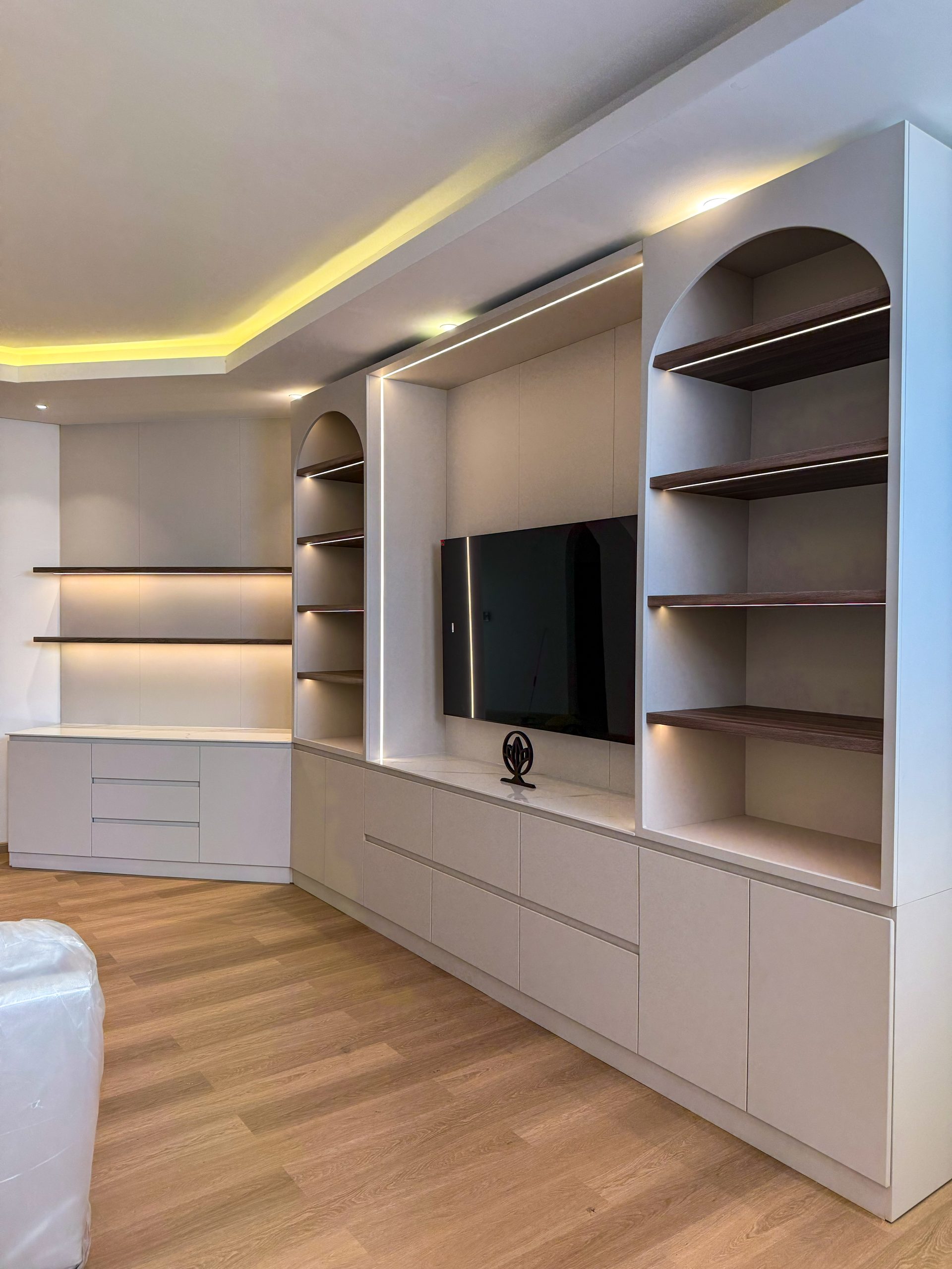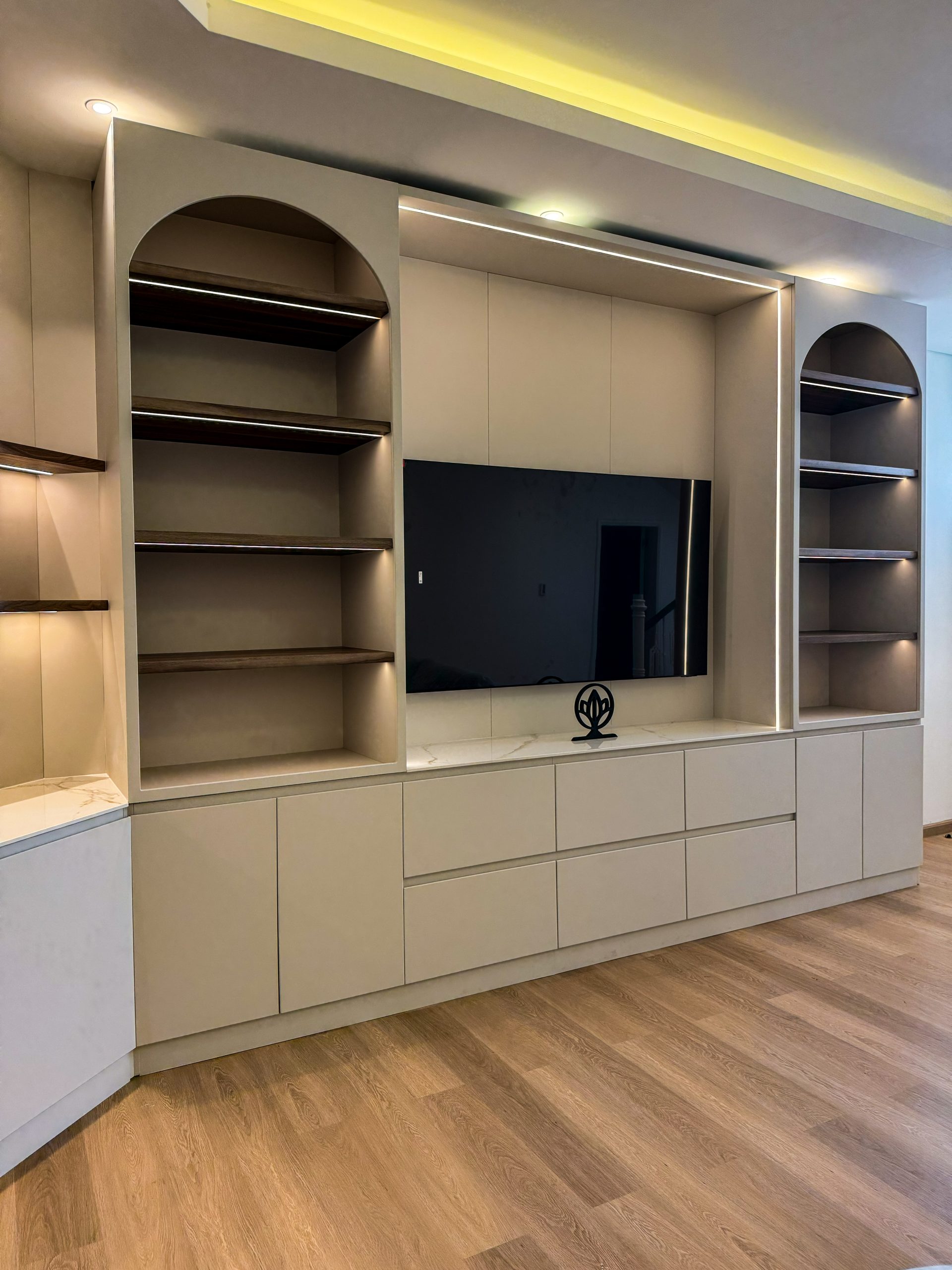 Upgrade your living space with the Elegant TV Unit | Custom Floating Cabinet & Panel Finish in Al Khan, a meticulously designed feature that combines modern elegance with functional storage. This bespoke media unit is crafted to create a sleek, organized focal point in your living room while enhancing the overall interior aesthetic.