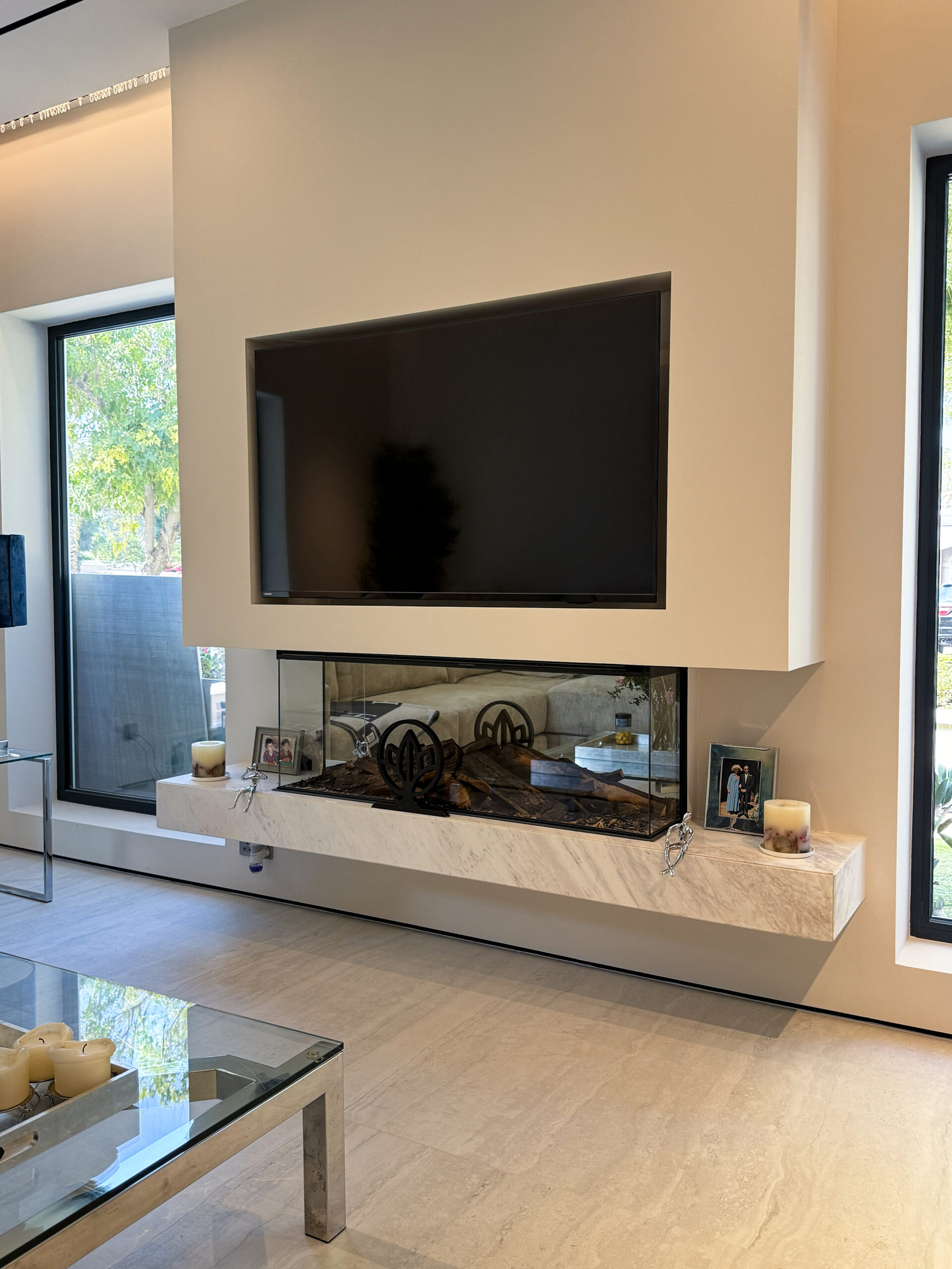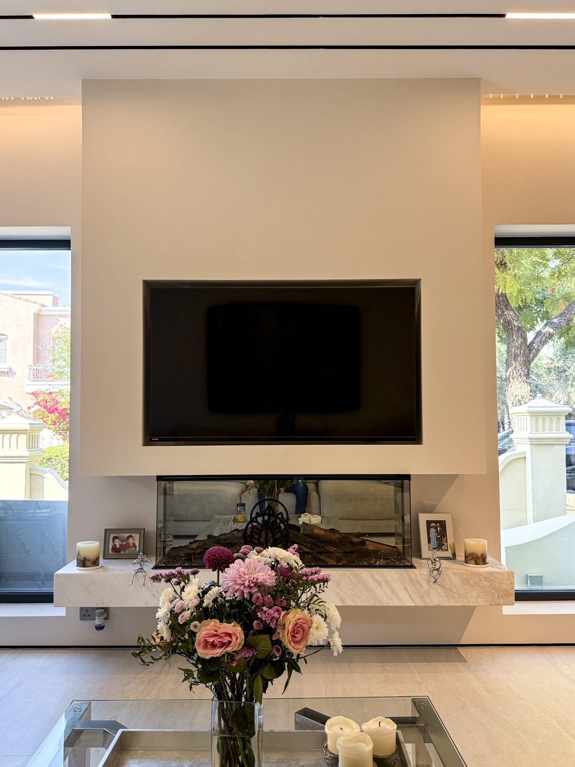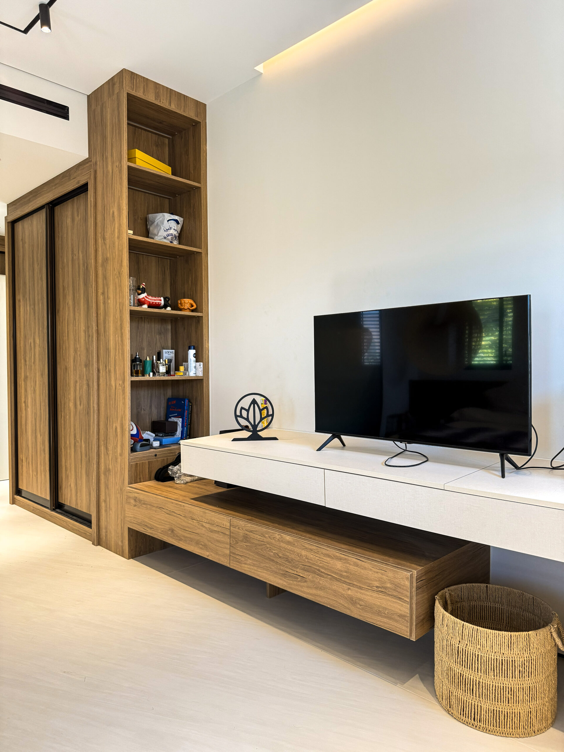 Sleek Media Center Design | Minimalist Plastered Wall & Natural Marble Accent