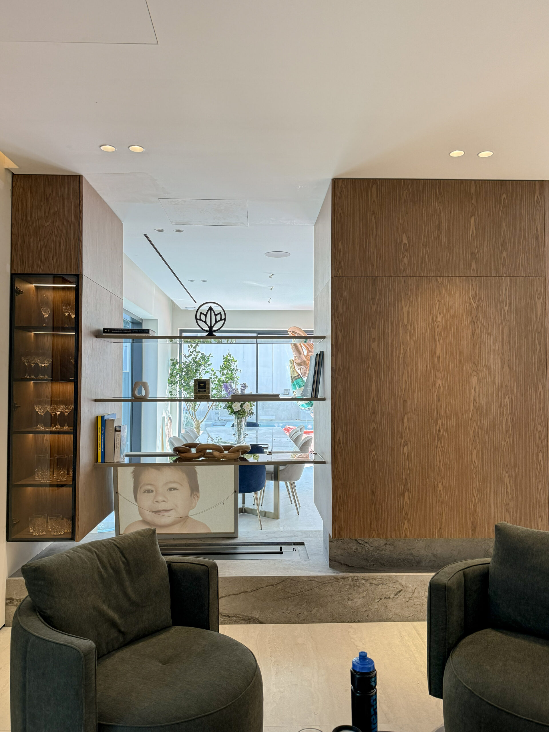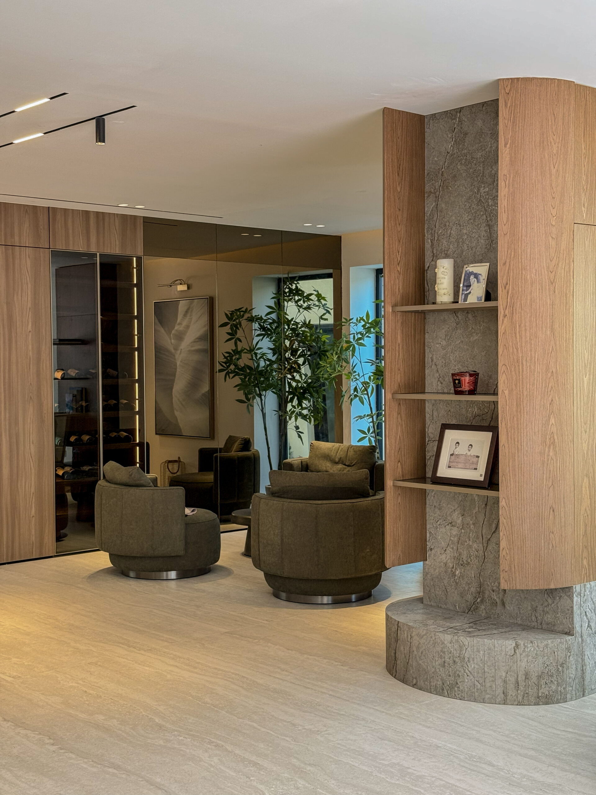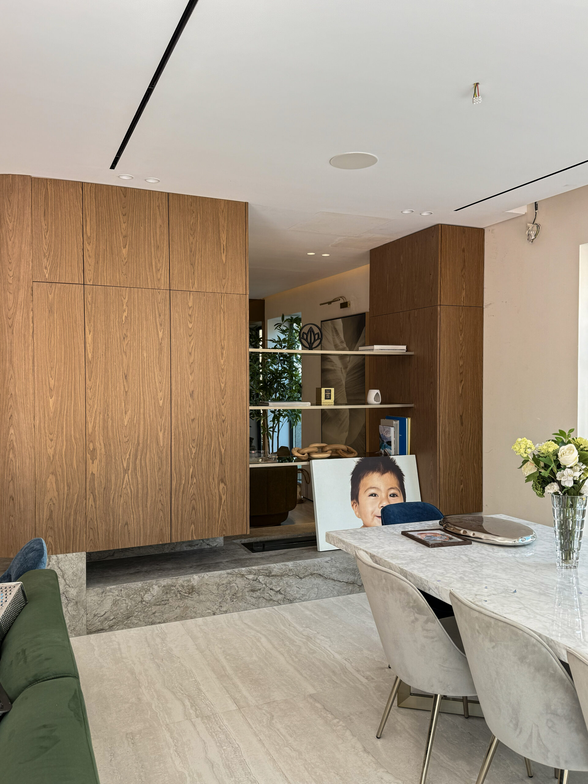 Sleek Media Center Design | Minimalist Plastered Wall & Natural Marble Accent