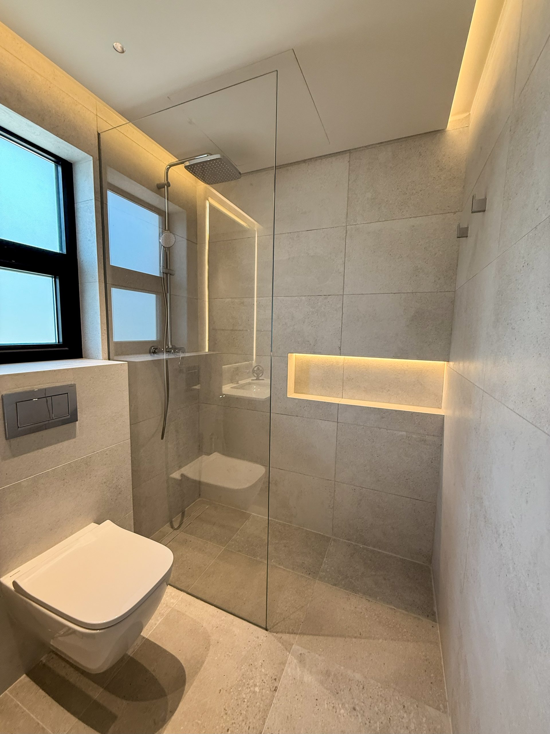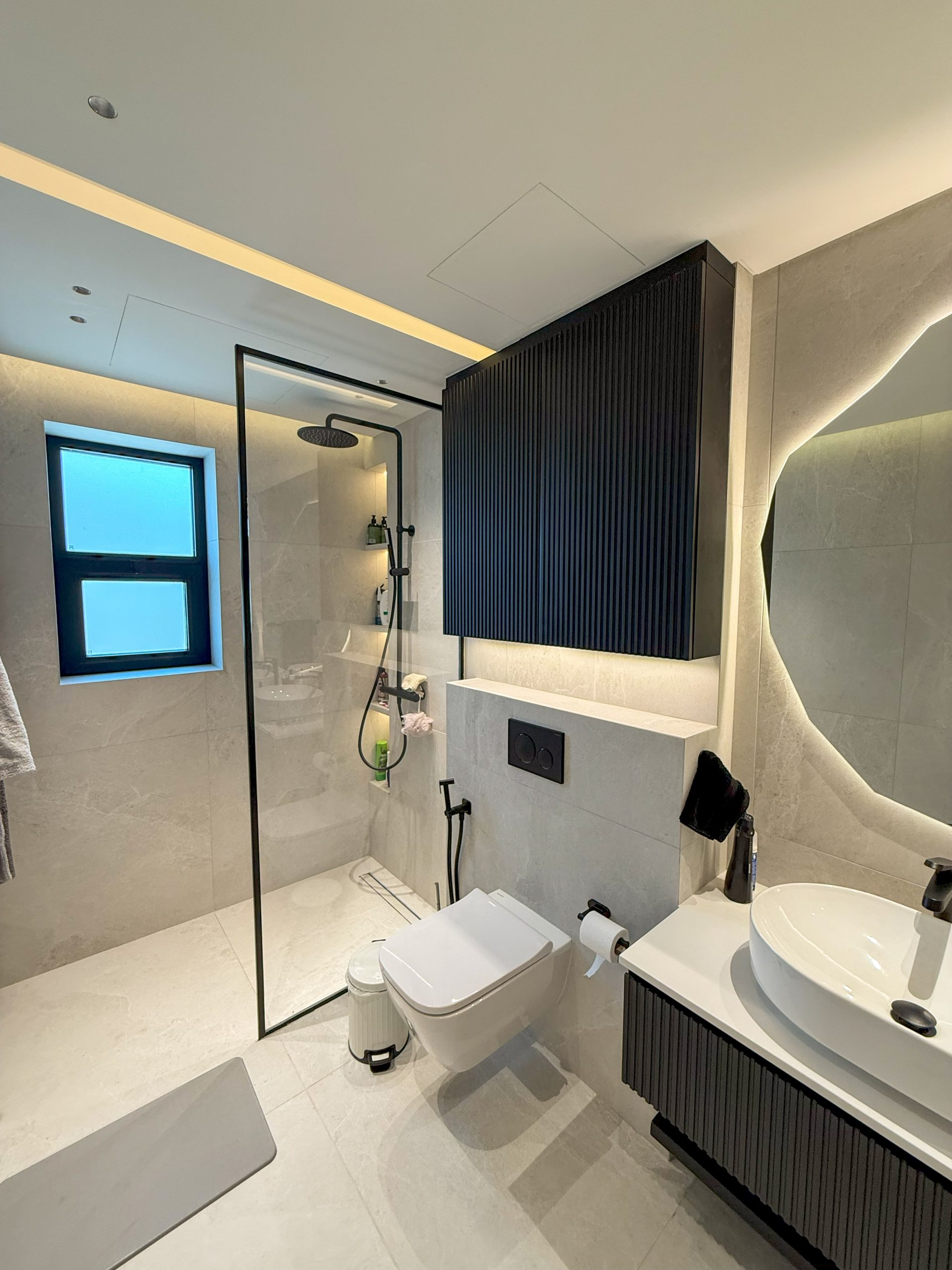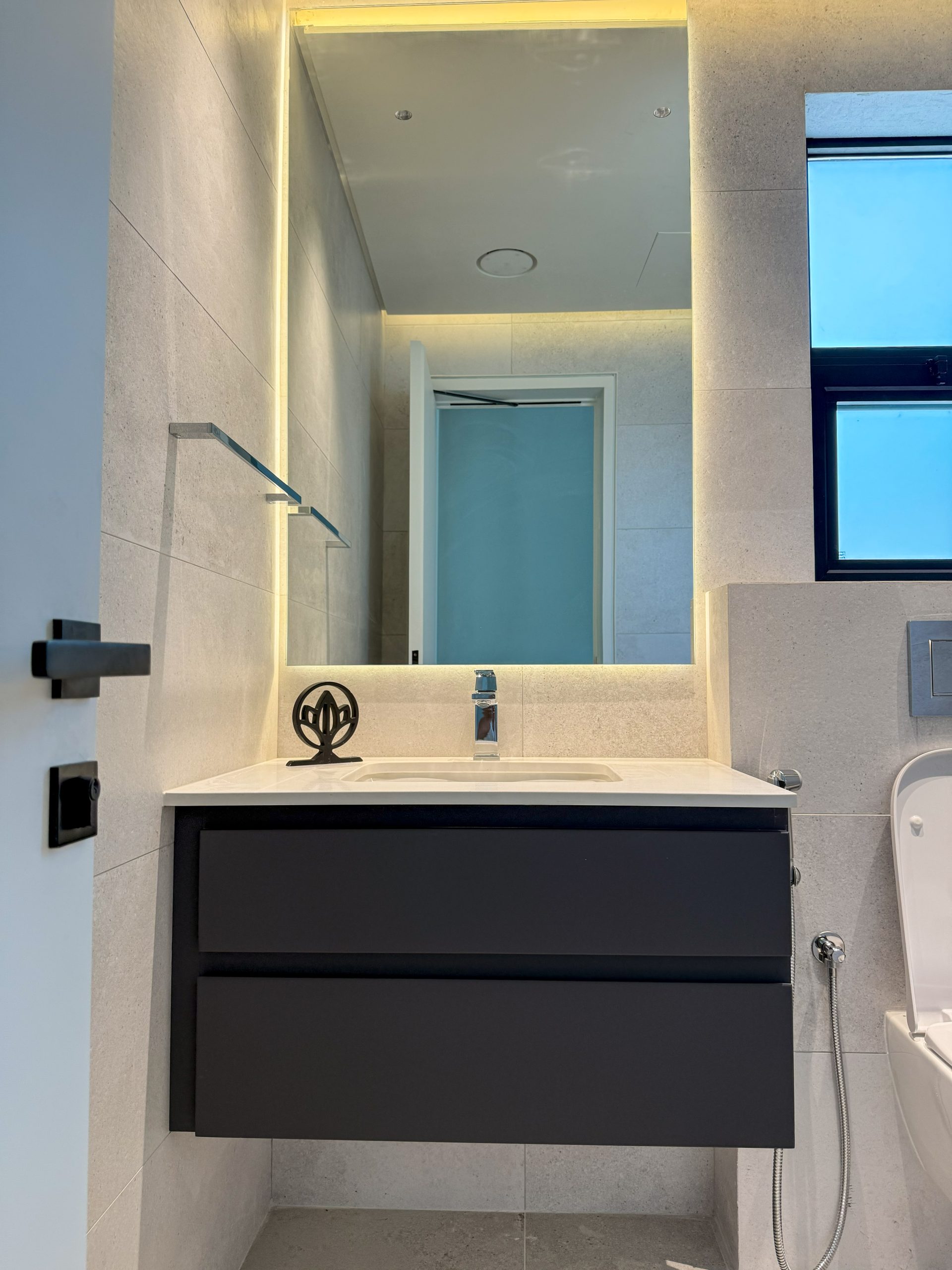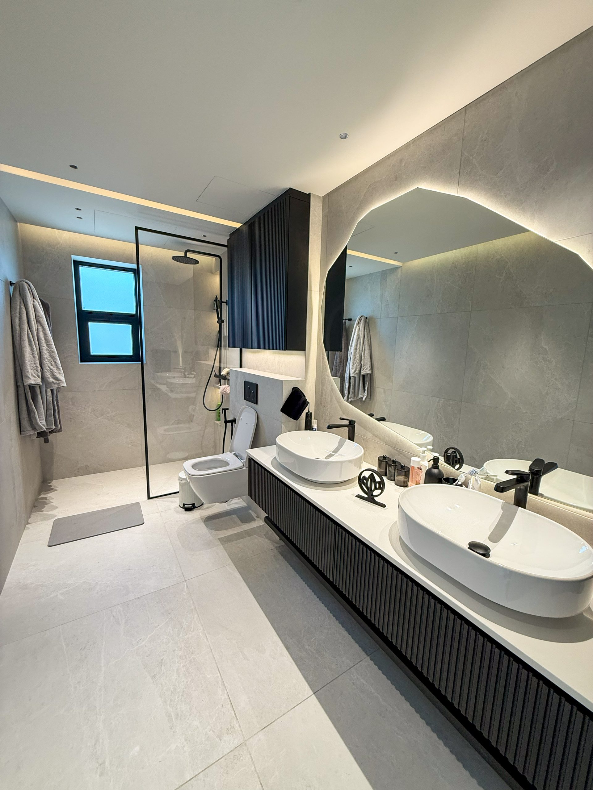 Defined by fluted charcoal joinery, precise detailing, and premium finishes, the vanity adds depth and architectural interest without overwhelming the space. Its floating structure provides a sense of lightness, improves accessibility for cleaning, and complements modern minimalist interiors.